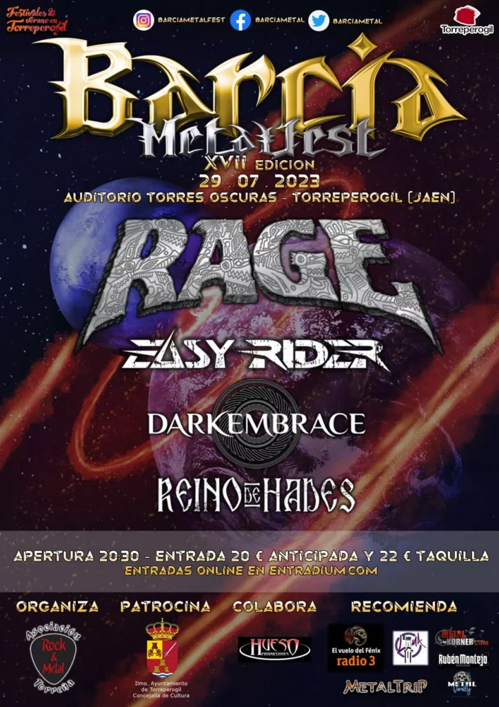 Rage, Easy Rider, Reino de Hades y Dark Embrace compartirán escenario en la decimoséptima edición del Barcia Metalfest, que se llevará a cabo el 29 de julio de 2023 en el Auditorio Torres Oscuras de la localidad jinense de Torreperogil. Entradas a la venta en al precio de 20,97 (gastos incluidos) en https://entradium.com