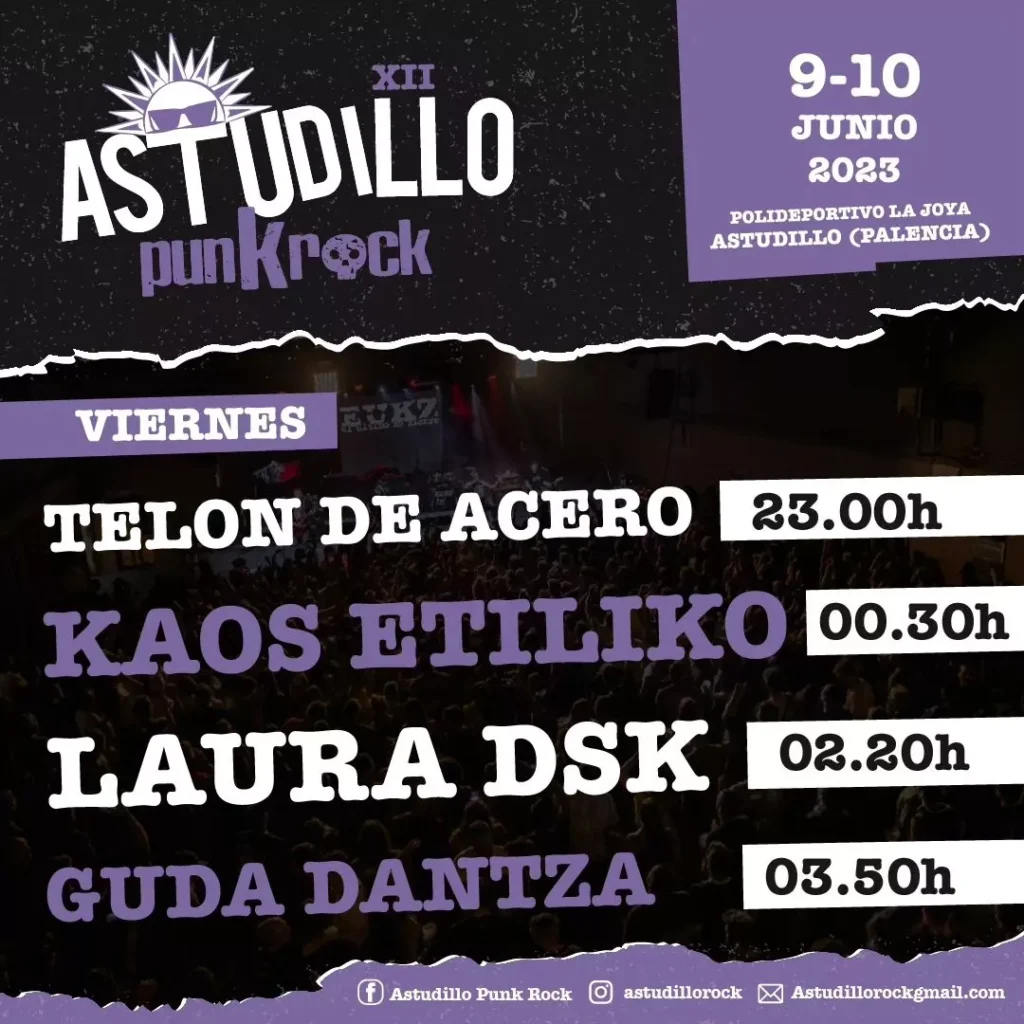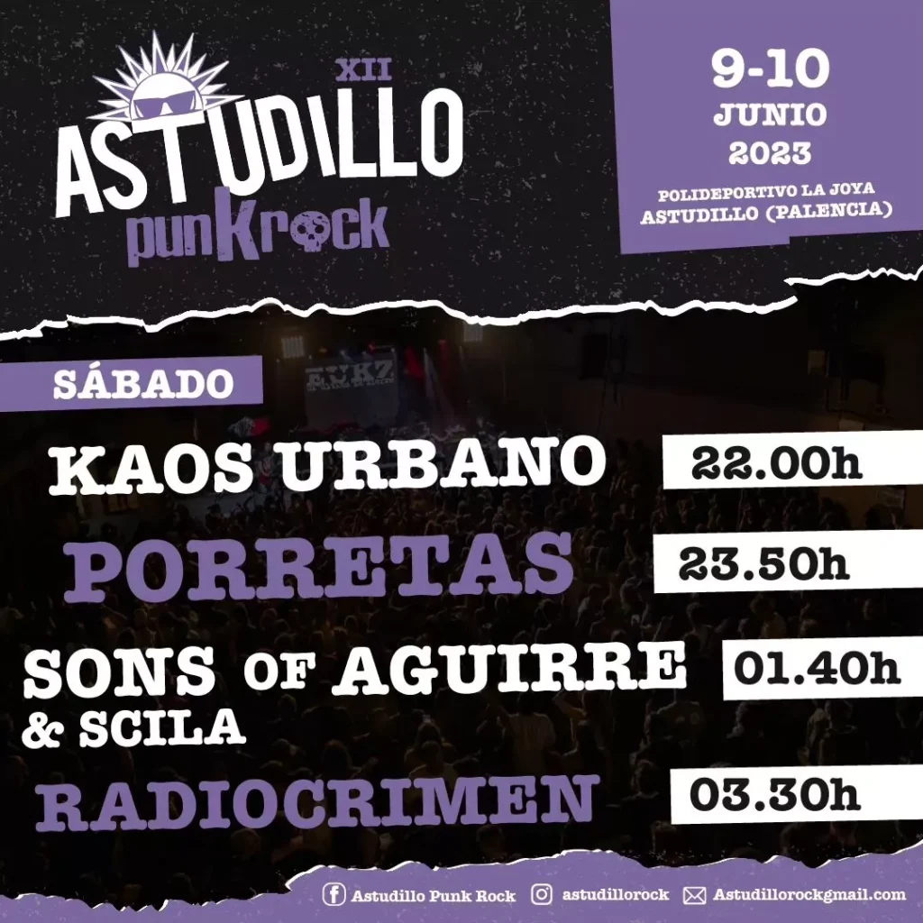 Este viernes y sábado tendrá lugar una nueva edición del Astudillo Punk Rock en el polideportivo La Joya (Astudillo, Palencia). Las bandas que actuarán son las siguientes: Guda Dantza, Kaos Urbano, Sons of Aguirre & Scila, Radiocrimen, Porretas, Kaos Etiliko, Telón de Acero y Laura DSK. Os damos a conocer los horarios de las actuaciones. Entrada viernes: 15´75 euros, entrada sábado: 25´20 euros y abonos de dos días: 31´50 euros en https://www.woutick.es