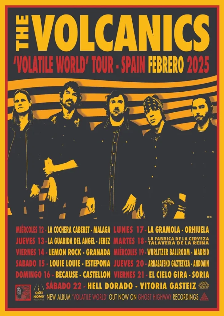 La banda australiana de rock’n’roll The Volcanics trae su explosivo show de garage rock de alta energía a España en febrero de 2025, como parte de la gira de presentación de su último álbum “Volatile World”, y sus primeros conciertos en Europa tras seis años de ausencia. La gira comenzará el 12 de febrero en La Cochera Cabaret (Málaga) y continuará con paradas en Jerez, Granada, Estepona, Castellón, Madrid, Andoain, Soria, y concluirá en la prestigiosa sala Hell Dorado en (Gasteiz) el sábado 22 de febrero.