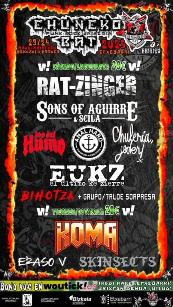 Rat-Zinger, Sons of Aguirre & Scila, Los Del Humo, Anal Hard, Chulería Joder!, Koma, El Último Ke Zierre, Bihotza, Eraso V, Skinsects y un grupo sorpresa son las formaciones que participarán en la próxima edición del Ehuneko Bat, que tendrá lugar los días 23 y 24 de mayo en Bekosolo Parkea (Etxebarri, Bizkaia).