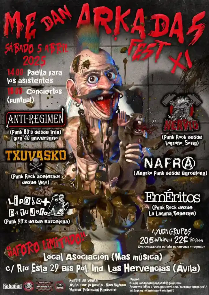 El 5 de abril tendrá lugar la undécima edición del Me Dan Arkadas Fest en el local de la Asociación Cultural de Artistas Alternativos de Avila, Másmúsica, La Kasita de Avila. Los organizadores siguen apostando por su filosofía autofinanciada y autogestionada, dando la oportunidad a bandas que lo tienen complicado para abrirse camino. El cartel de este año sigue la estela de ediciones pasadas, formaciones de gran calidad y tremenda actitud sobre el escenario, Anti-Regimen, Nervio, Liposo + Pa Tu Jeto, Nafra, Txuvasko y EmÉritos.