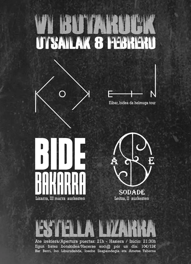 El 8 de febrero tendrá lugar la sexta edición del BotaRock en la Peña La Bota (Lizarra, Navarra) con las actusaciones de Sodade, que presentarán su nuevo disco “II”, los locales Bode Bakarra, que darán a conocer las canciones de su tercer disco “Hiru Marra” y los eibarreses Kokein, que se encuentran celebrando sus 25 años de andadura musical con su nueva gira “Bide Da Helmuga”.  21:30 horas. Anticipada: 10 euros en el Bar Berri, Ino Liburudenda, Iosebe Ileapaindegia y Ametsa Taberna. En taquilla: 12 euros.