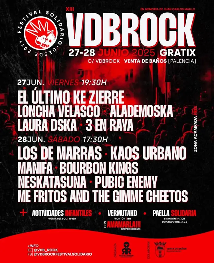 La decimotercera edición del festival solidario de VdB Rock tendrá lugar los días 27 y 28 de junio en Venta de Baños (Palencia). El cartel está formado por las siguientes formaciones: El Último Ke Zierre, Loncha Velasco, AlaDeMoska, Laura Dsk, 3 En Raya, Los De Marras, Kaos Urbano, Manifa, Bourbon Kings, Neskatasuna, Pubic Enemy y Me Fritos And The Gimme Cheetos. Además habrá Paella Solidaria, Vermut y actividades infantiles. Entrada libre.