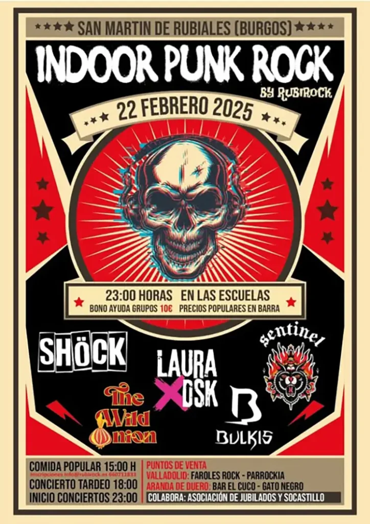 El 22 de febrero se celebrará la primera edición del Indoor Punk Rock en Las Escuelas (San Martín de Rubiales, Burgos), con las actuaciones de Shöck, Laura Dsk, Sentinel, Bulkis y The Wild Onion. Bono ayuda grupos: 10 euros en Faroles Rock (Valladolid), Parrockia (Valladolid), Bar El Cuco (Aranda de Duero) y El Gato Negro (Aranda de Duero). Habrá comida popular, precios populares en barra y concierto de tardeo.