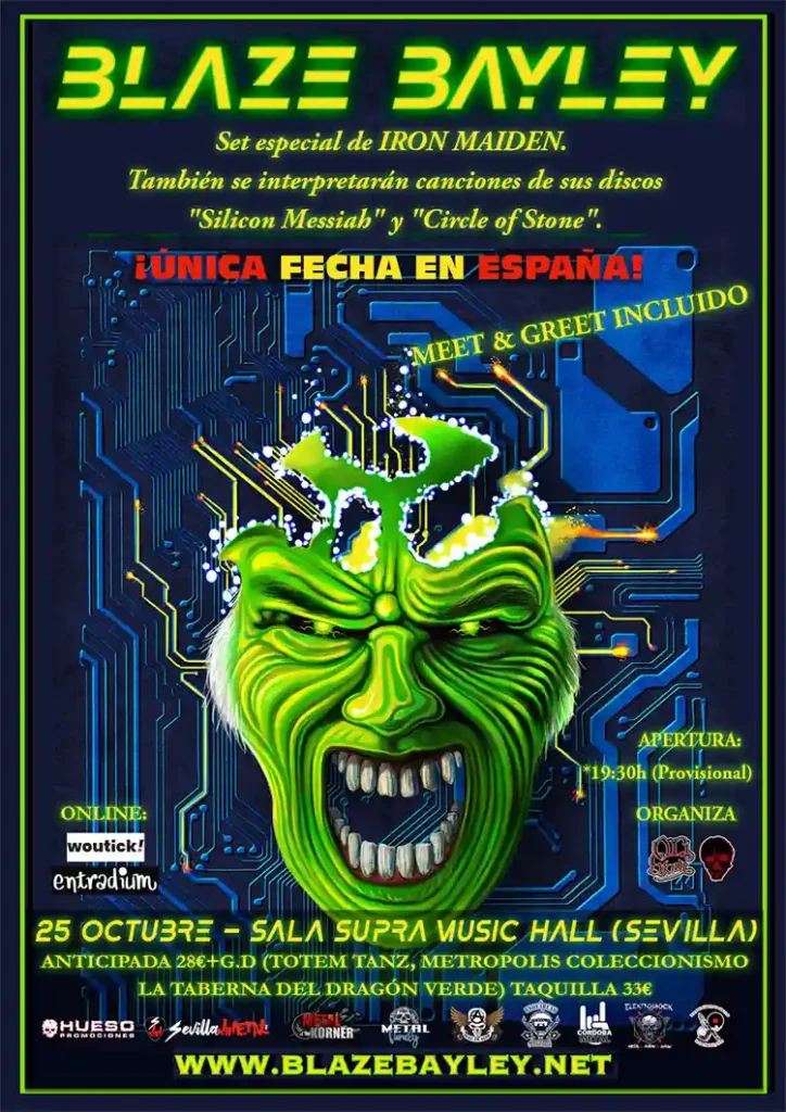 El legendario Blaze Bayley, ex vocalista de Iron Maiden, ofrecerá un concierto único e irrepetible en España este 2025. En una noche que promete ser inolvidable para los amantes del heavy metal,Blaze interpretará muchos temas de Iron Maiden, , además de incluir temas destacados de sus aclamados trabajos en solitario como “Silicon Messiah” y “Circle of Stone”. La cita será el 25 de octubre de 2025 en la Sala Supra de Sevilla. Este será el único concierto que Blaze Bayley ofrecerá en España, convirtiéndolo en una oportunidad irrepetible para disfrutar de su potente voz y carisma en directo.