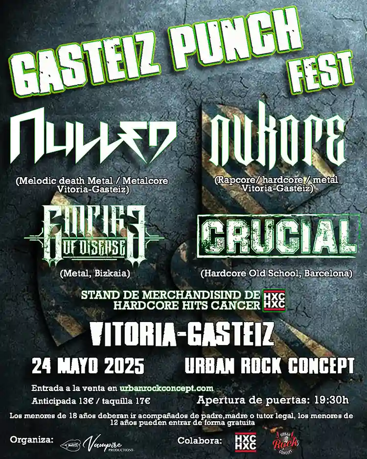 La sala Urban Rock Concept (Gasteiz) acogerá el 24 de mayo el festival Gasteiz Punch Fest, con las actuaciones de Nulled, Nukore, Empire Of Disease y Crucial. Una velada musical muy completa, con diferentes estilos de explosiones agresivas y una gran cantidad de recursos musicales en cada una de las bandas participantes. 19:30 horas. Anticipada: 13 euros más gastos en https://entradas.urbanrockconcept.com/es. En taquilla: 17 euros.