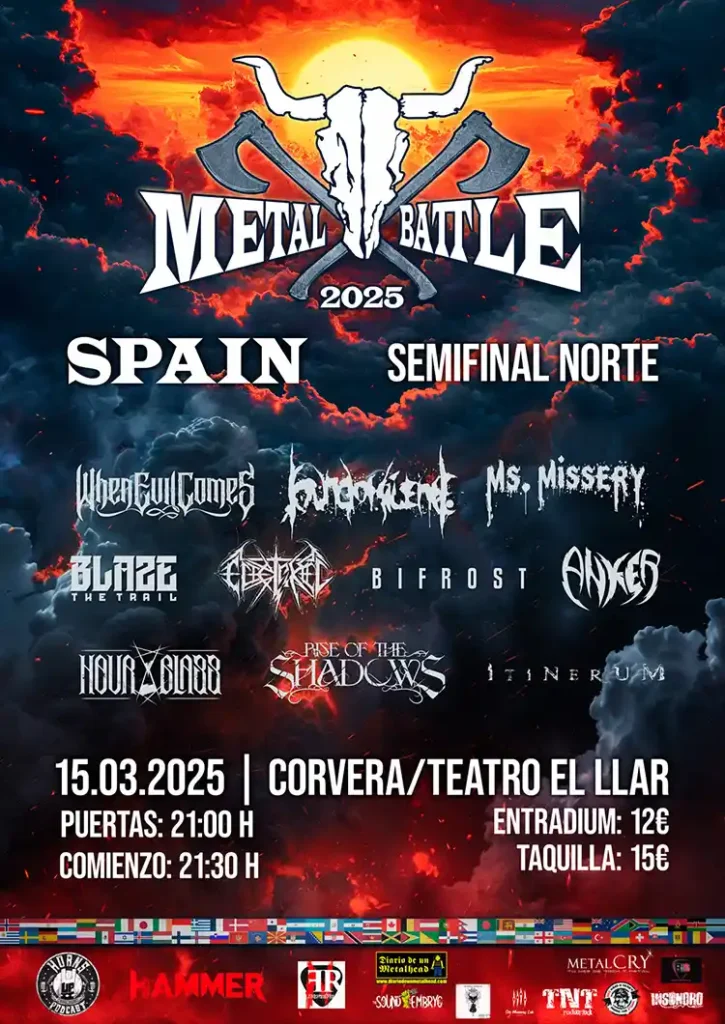 10 bandas compitiendo en directo, Hour-Glass, When Evils Come, Electrikeel, Itinerum, Sound Of Sielnce, Rise Of The Shadows, Blaze The Trail, Ms. Misery, Anker y Bifrost, para lograr clasificarse para la final nacional. Anticipada: 12 euros más gastos en https://entradium.com. En taquilla: 15 euros.