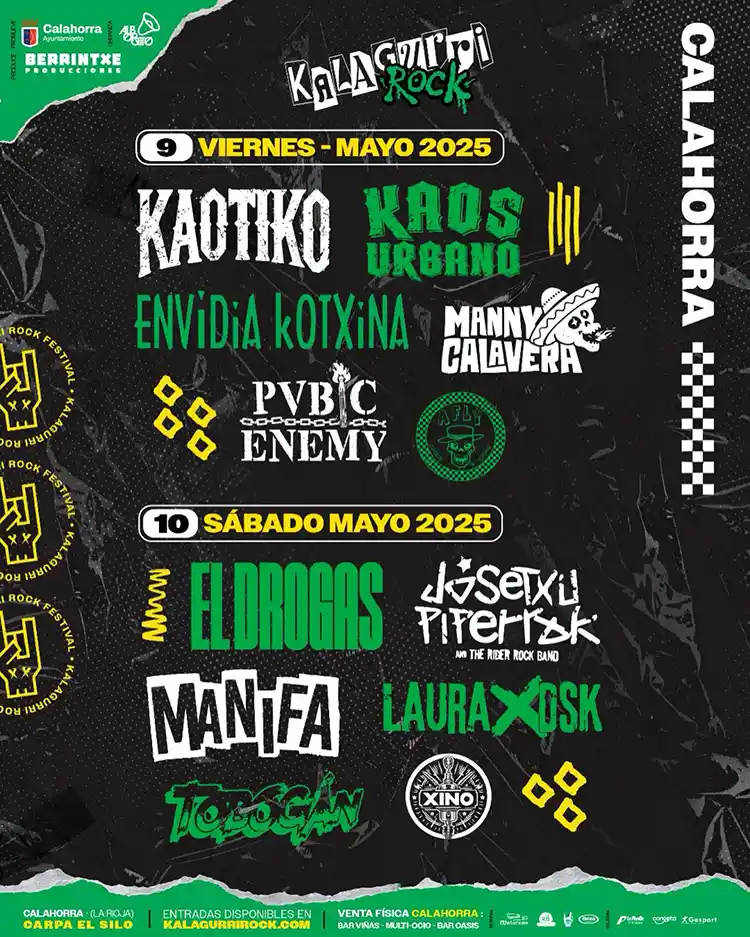 Los días 9 y 10 de mayo se celebrará una nueva edición del KalagurriRock, que se llevará a cabo en la Carpa El Silo (Calahorra, La Rioja). En la primera jornada actuarán Kaos Urbano, Kaotiko, Envidia Kotxina, Manny Calavera, Pubic Enemy y Afli. Al día siguiente le tocará el turno a El Drogas, Josetxu Piperrak & The Riber Rock Band, Manifa, Xino. Laura DSK, Tobogán. Abonos a la venta la precio de 37 euros más gastos en https://www.enterticket.es. Entradas de día al precio de 25 euros más gastos en https://www.enterticket.es.