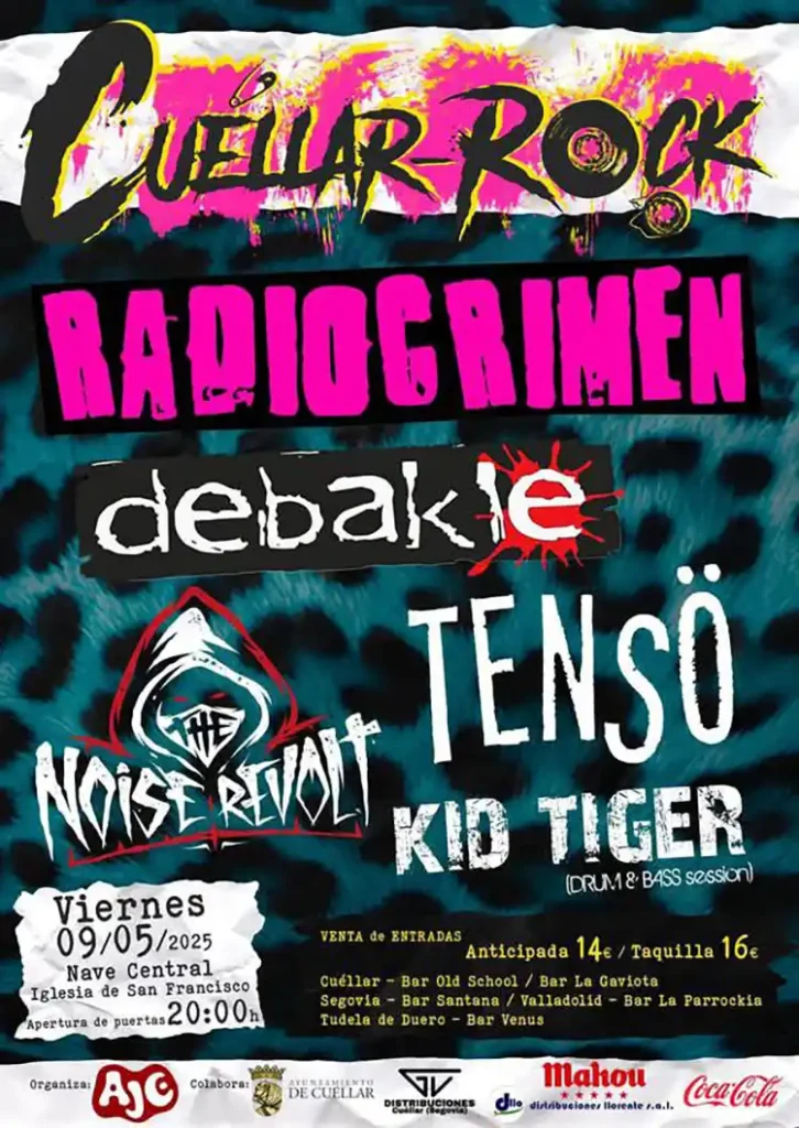 El 9 de mayo tendrá lugar el Cuellar Rock en la Nave Central de la Iglesia de San Francisco (Cuellar, Segovia). Las bandas que actuarán son las siguientes: Radiocrimen, Debakle, Tensö, Noise Revolt y Kid Tiger. 20:00 horas. Anticipada: 14 euros en Bar Old School (Cuellar), Bar La Gaviota (Cuellar), Bar Santana (Segovia), Bar La Parrockia (Segovia) y Bar Venus (Tudela de Duero). En taquilla: 16 euros.