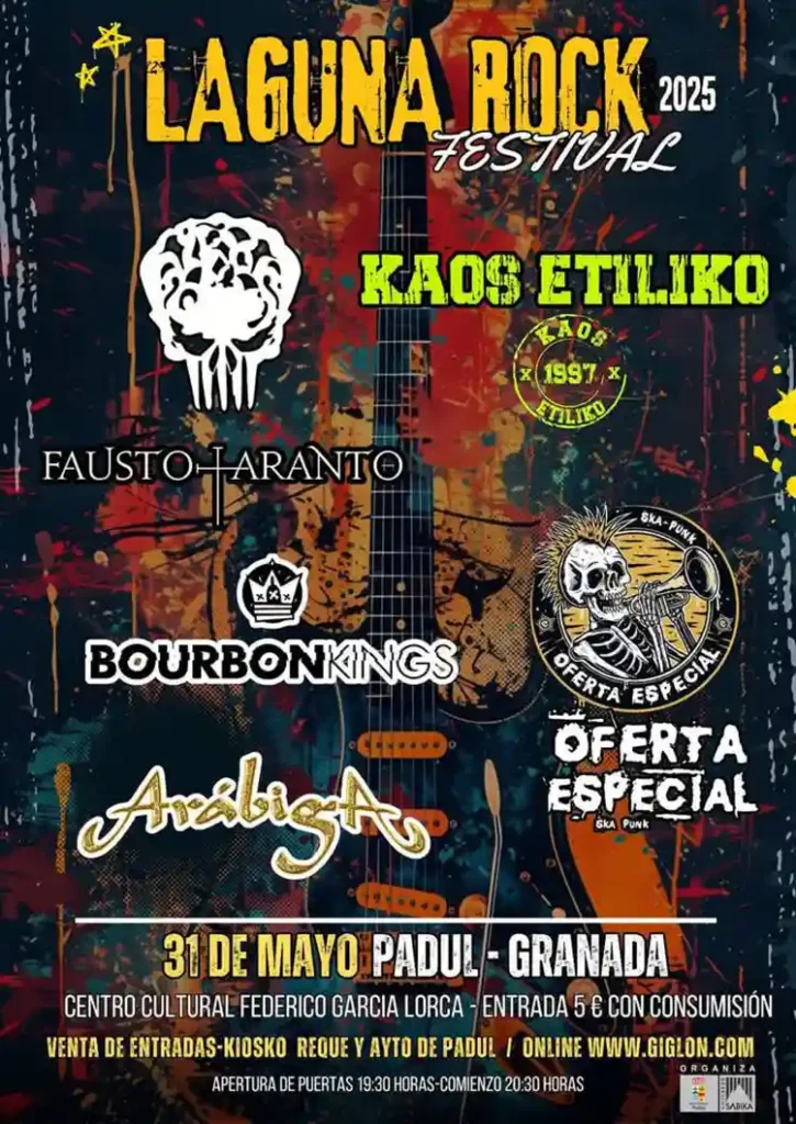 El 31 de mayo se celebrará una nueva edición del Laguna Rock Festival en el Centro Cultural Federico García Lorca (Padul, Granada), con un cartel plagado de buenas bandas nacionales. Las bandas que actuarán son las siguientes: Kaos Etiliko, Fausto Taranto, Bourbon Kings, Oferta Especial y Arábiga. Entradas al precio de 5 euros con consumición en Kiosko, Reque, Ayuntamiento de Padul y https://www.giglon.com