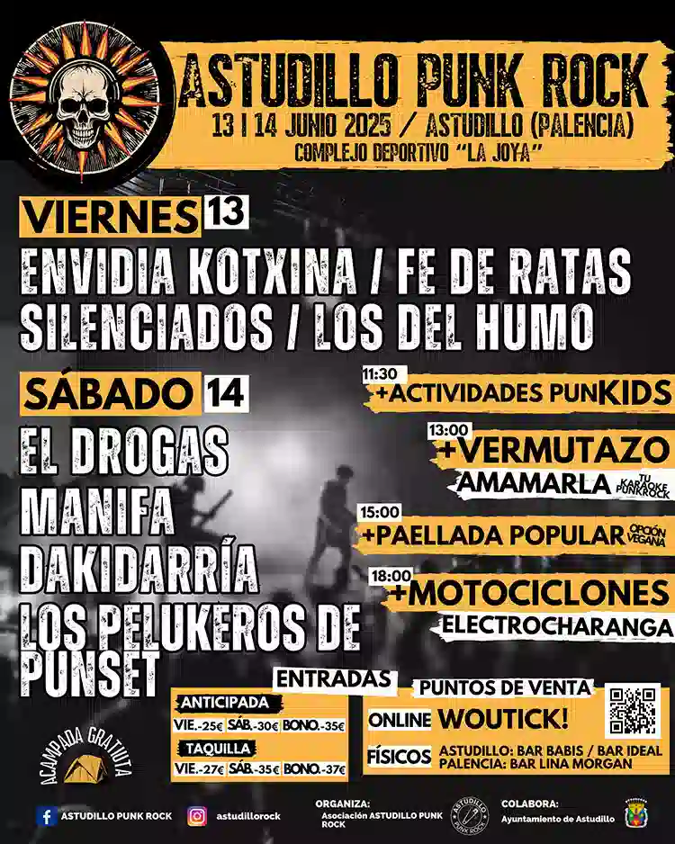 Los organizadores del Astudillo Punk Rock han presentado el cartel de la próxima edición del festival, que tendrá lugar los días 13 y 14 de junio de 2025 en Astudillo (Palencia), quedando de la siguiente manera.