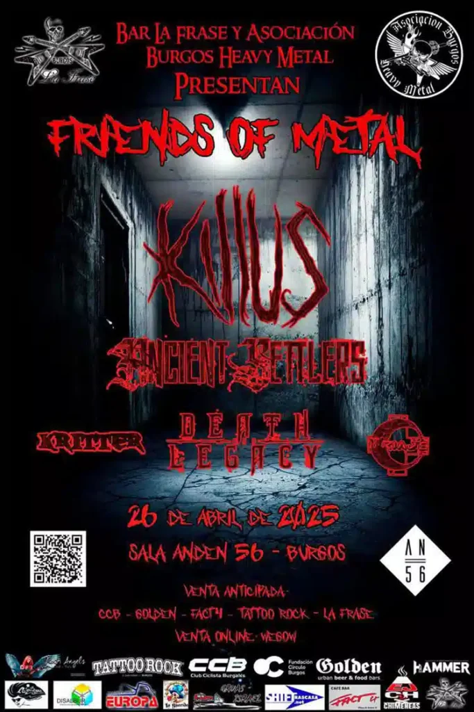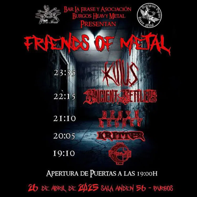 Este sábado se celebrará el festival Friends Of Metal en la sala Anden 56 (Burgos), con las actuaciones de Killus, Ancient Settlers, Death And Legacy, Kritter y Triaje. Evento organizado por la asociación burgalesa dedicada a promover conciertos y eventos, Burgos Heavy Metal. Un organismo sin ánimo de lucro que nace para la promoción y difusión del estilo musical Heavy Metal en todas sus vertientes. Su principal objetivo es la creación de eventos tales como conciertos, festivales, etc. En un radio de acción que se extiende por toda la provincia de Burgos.
