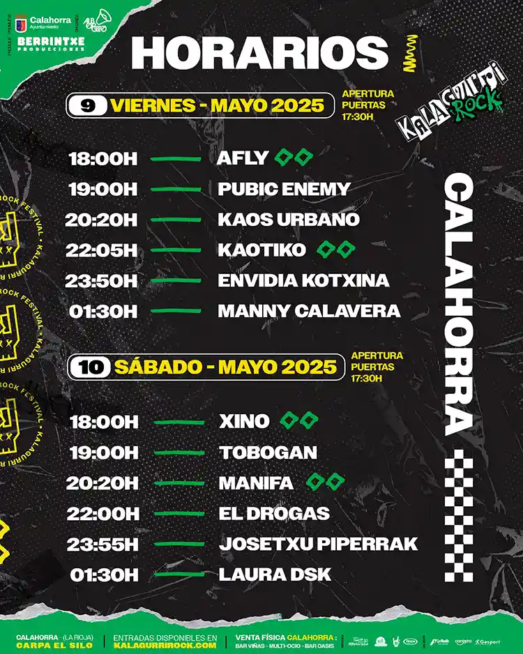 Los días 9 y 10 de mayo se celebrará una nueva edición del KalagurriRock, que se llevará a cabo en la Carpa El Silo (Calahorra, La Rioja). En la primera jornada actuarán Kaos Urbano, Kaotiko, Envidia Kotxina, Manny Calavera, Pubic Enemy y Afli. Al día siguiente le tocará el turno a El Drogas, Josetxu Piperrak & The Riber Rock Band, Manifa, Xino. Laura DSK, Tobogán. Abonos a la venta la precio de 37 euros más gastos en https://www.enterticket.es. Entradas de día al precio de 25 euros más gastos en https://www.enterticket.es. Ya se encuentran disponibles los horarios de las actuaciones.