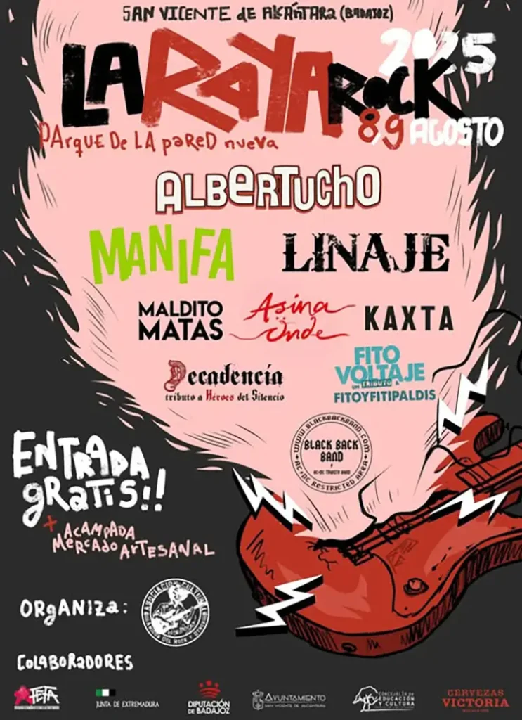 Albertucho, Manifa, Linaje, Maldito Matas, Kaxta, Asina Önde, Decadencia (tributo a Héroes del Silencio), Fitovoltaje (tributo a Fito & Fitipaldis), Black Back Band son las formaciones que actuarán en la nueva edición de La Raya Rock, que se celebrará los días 8 y 9 de agosto en el parque de la pared nueva, San Vicente de alcantara (Badajoz). Entrada libre. Habrá mercado artesanal, zona de acampada y food truck.