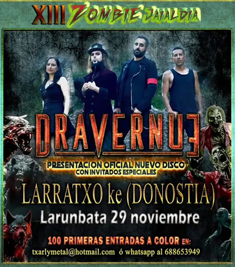 Los donostiarras Dravernue llevarán a cabo la presentación oficial de su segundo disco en la decimotercera edición del Zombie Jaialdia, que tendrá lugar el 29 de noviembre en el Centro Cultural Larratxo (Donosti). Será una actuación especial con músicos invitados y compartiendo escenario con los riojanos Zenobia y otra banda más por anunciar. Pimeras 100 entradas a color en: txarlymetal@hotmail.com ó whatsapp al 688653949.