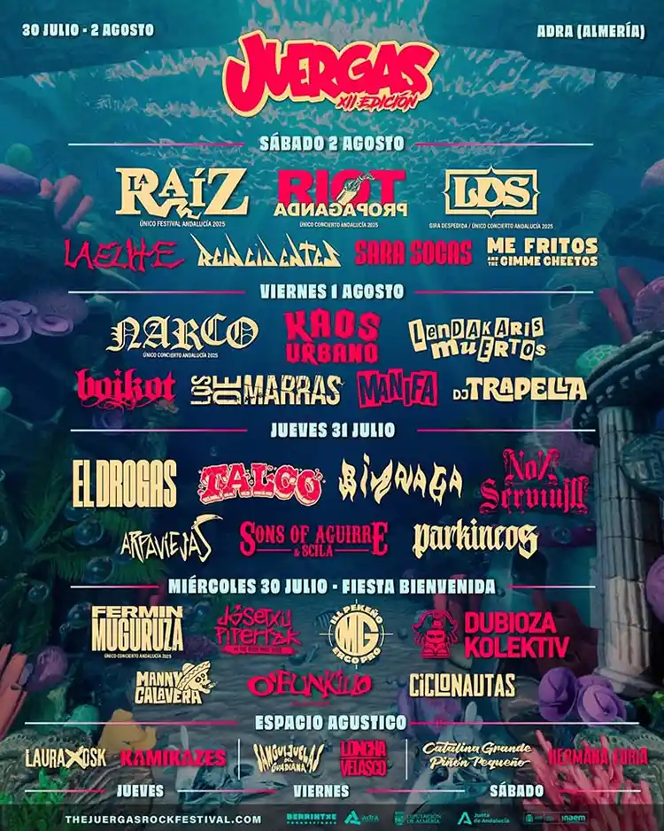 Ya se conocen como quedan repartidas las bandas por días para la próxima edición del The Juergas Rock Fest, que se llevará a cabo del 30 de julio al 2 de agosto en Adra (Almería). Abonos de 4 dias al precio de 60 euros más 6 euros de gastos de gestión en https://www.enterticket.es