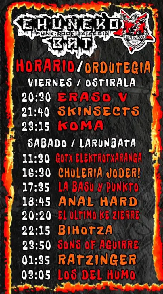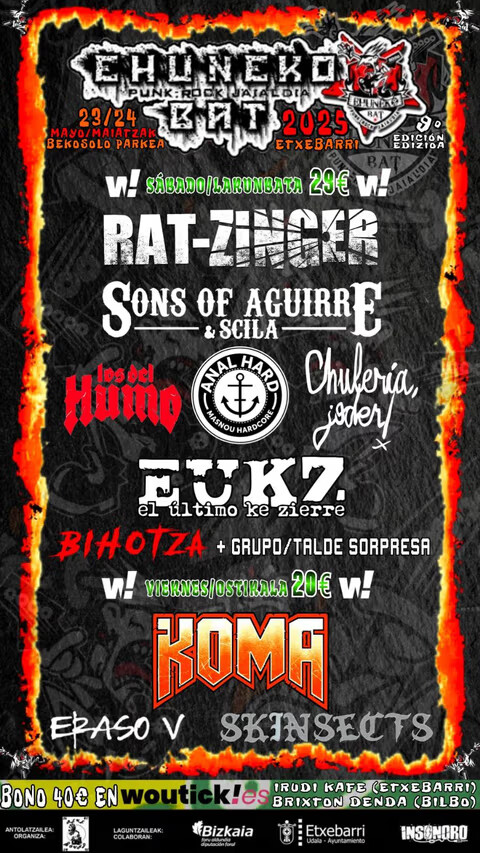 Este viernes y sábado tendrá lugar una nueva edición del festival bizkaino Ehuneko Bat en Bekosolo Parkea (Etxebarri, Bizkaia). En al primera jornada actuarán Koma, Skinsects y Eraso V. Al día siguiente le tocará el turno a Chulería Joder!, La Basu y Punkto, Anal Hard, El Último Ke Zierre, Bihotza, Sons Of Aguirre, Rat-Zinger y Los Del Humo.