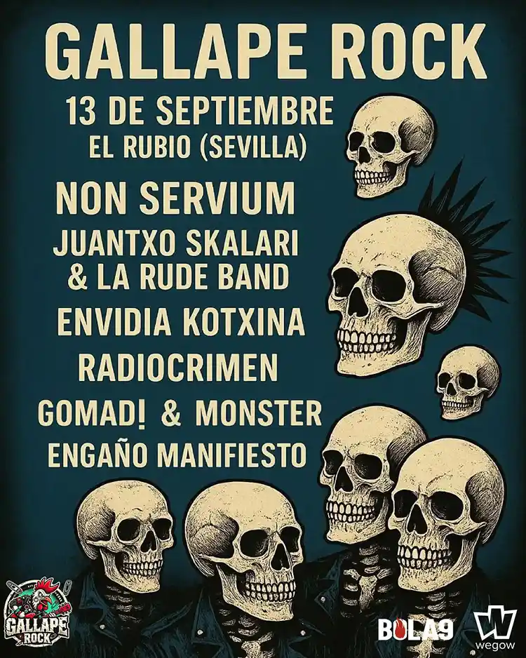 Los organizadores del Gallape Rock han confeccionado un cartel muy atractivo y de gran calidad para la decimocuarta edición del festival, que se celebrará el 13 de septiembre en El Rubio (Sevilla). Las bandas que participarán son las siguientes: Non Servium, Juantxo Skalari & La Rude Band, Envidia Kotxina, Radiocrimen, Gomad! & Monster y Engaño Manifiesto. Aforo limitado. Acampada gratuita en la pisicina municipal. Entradas a la venta en https://www.wegow.com