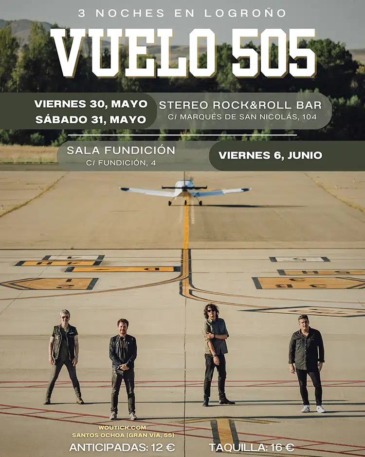 Los dos últimos singles de Vuelo 505 que han compartido, “La montaña rusa de la ropasucia” y éste, formarán parte del repertorio que defenderán los de Logroño en su ciudad natal en Stereo RocknRoll Bar (harán escala en dicho local los días 30 y 31 de mayo) y sala Fundición, el 6 de junio: tres fechas, tres, en la capital riojana. Tres aterrizajes, demostrando ser profetas en su tierra… por partida triple. Las entradas para estos conciertos ya están disponibles en woutick.com