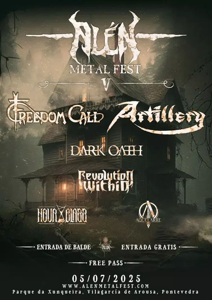 Freedom Call, Artillery, Aquelarre, Hour-Glass, Dark Oath y Revolution Within son las formaciones que participarán en la quinta edición del Alén Metal Fest, que se llevará a cabo el 5 de julio en el Parque da Xunqueira (Vilagarcía de Arousa, Pontevedra). Entrada libre.