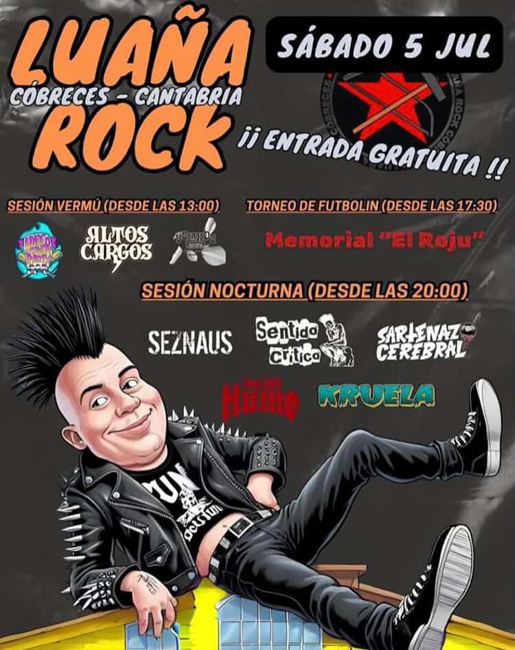 Los del Humo, Sartenazo Cerebral, Kruela, Sentido Crítico y SezNaus compartirán escenario en la próxima del Luaña Rock, que tendrá lugar el 5 de julio en Cóbreces (Cantabria). Además habrá sesión vermú desde las 13:00 horas con Altos Cargos, Volando Boys y Under Cover Party, y un torneo de futbolín desde las 17:30 horas. Todos totalmente gratis.