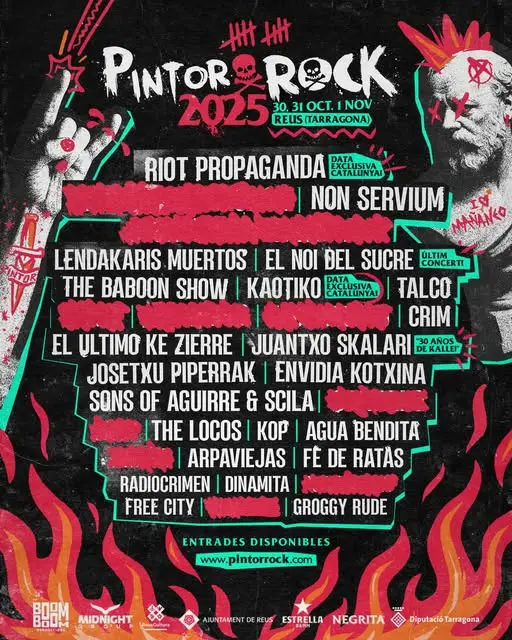 Riot Propaganda, Non Servium, Lendakaris Muertos, El Noi de Sucre, The Babbon Show, Kaotiko, Talco, Crim, El Último Ke Zierre, Juantxo Skalari & La Rude Band, Josetxu Piperrak & The Riber Rock Band, Envidia Kotxina, Sons of Aguirre, The Locos, KOP, Agua Bendita, Arpaviejas, Fe de Ratas, Radiocrimen, Dinamita, Free City y Groggy Rude conforman la primera tanda de confirmaciones de la décima edición del PintorRock, que se celebrará del 30 de octubre al 1 de noviembre en Reus (Tarragona). Abonos a la venta al precio de 45 euros más gastos de gestión en https://entradas.codetickets.com