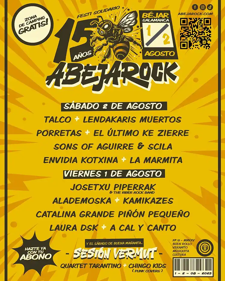 Los días 1 y 2 de agosto se llevará a cabo la decimoquinta edición del AbejaRock en Béjar (Salamanca). En la primera jornada actuarán Talco, Lendakaris Muertos, Porretas, El Último Ke Zierre, Sons Of Aguirre & Scila, Envidia Kotxina y La Marmita. En la segunda jornada le tocará el turno a Josetxu Piperrak & The Riber Rock, AlaDeMoska, Kamikazes, Catalina Grande Piñón Pequeño, Laura Dsk y A Cal y Canto. Abonos al precio de 35 euros más 3,50 euros de gastos de distribución en https://woutick.com