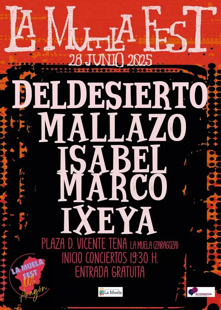 El Ayuntamiento de La Muela apuesta de esta forma por la cultura aragonesa y por la música en directo, favoreciendo el tejido cultural aragonés y contando con empresas y grupos de Aragón. La producción corre a cargo de la empresa aragonesa Alternativa Management. 19:30 horas. Entrada gratuita.