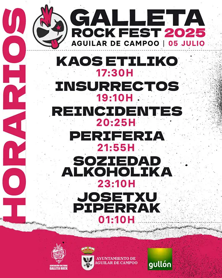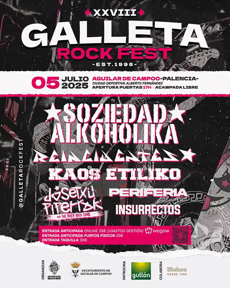 Insurrectos, Josetxu Piperrak & The Riber Rock Band, Periferia, Reincidentes, Kaos Etiliko y Soziedad Alkoholika son las formaciones que participarán este sábado en la vigésima octava edición del Galleta Rock Fest, que se celebrará en la Ciudad Deportiva Alberto Fernández de la localidad palentina de Aguilar de Campoo. 17:00 horas Entradas a la venta al precio de 25 euros más gastos en https://www.wegow.com