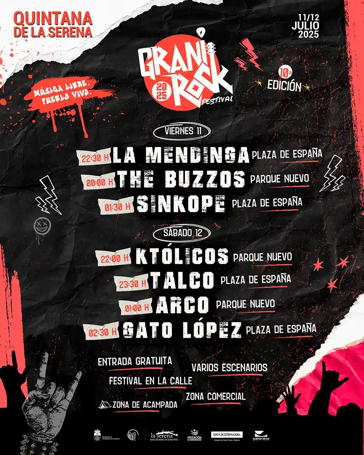 Ya se han dado a conocer como quedan repartidas las bandas por las dos jornadas en la que constará la décima edición del Granirock Festival, que se llevará a cabo los días 11 y 12 de julio en Quintana de la Serena (Badajoz). En la primera jornada actuarán La Mendiga, The Buzzos y Sínkope. Al día siguiente le tocará el turno a Któlicos, Talco, Arco, Gato López. Las actuaciones se desarrollarán en diferentes escenarios ubicados por toda la localidad. Entrada gratuita y zona de acampada libre.