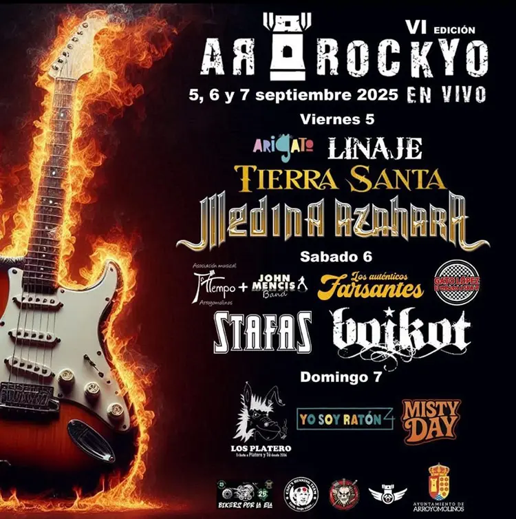 Los días 5,6 y 7 de septiembre se celebrará la sexta edición del Arrockyo en vivo en Arroyomolinos (Madrid). En la primera jornada actuarán Linaje, Tierra Santa y Medina Azahara, además del espectáculo infantil Arigato. En la segunda jornada pondrá el ambiente La asociación musical A Tempo junto a John Mencis Band, Los Auténticos Farsantes, Gato López (tributo a Ska-P), Stafas y Boikot. En la última jornada se podrá disfrutar de las actuaciones de Yo Soy Ratón, Misty Day y Los Platero (tributo a Platero y Tú). Entrada libre. La recaudación de la venta de los vasos reutilizables será donada a la Asociación Bikers por la ELA.