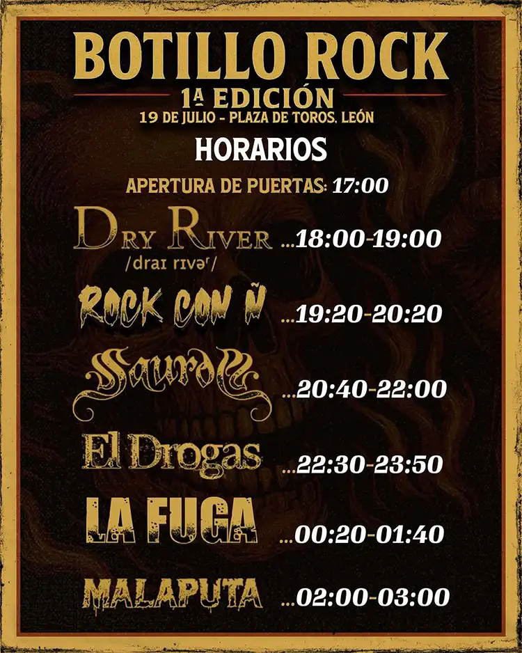 Este sábado se celebrará la primera edición del festival Botillo Rock, con las actuaciones de El Drogas, La Fuga, Saurom, Rock Con Ñ, Malaputa y Dry Driver, en la Plaza de Toros de León. Un evento musical con lo mejor de rock nacional en la actualidad. 18:00 horas. Anticipada: 38,50 euros (gastos incluidos) en https://woutick.com Os facilitamos los horarios de las actuaciones.