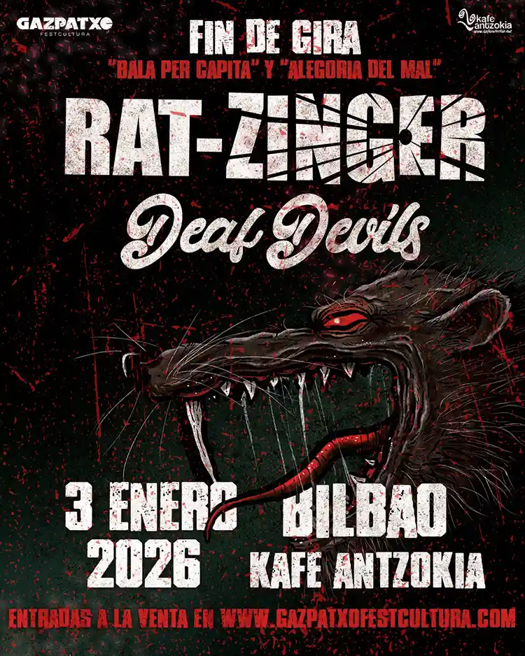 El Kafe Antzokia (Bilbo) acogerá el día 3 de enero de 2026 una velada llena de energía y ritmo, una jubilosa velada de rock’n’roll de la vieja escuela a cargo de los valencianos Deaf Devils y los bilbaínos Rat-Zinger, quienes darán por finalizada  la gira de presentación de su disco “Bala Per Cápita” y “Alegoría del Mal”, dejando de manifiesto sus influencias motörheadianas, gran rotundidad en los riffs y un sonido totalmente cohesionado, jugando con su vertiente más agresiva. Entradas a la venta en https://www.gazpatxofestcultura.com/entradas