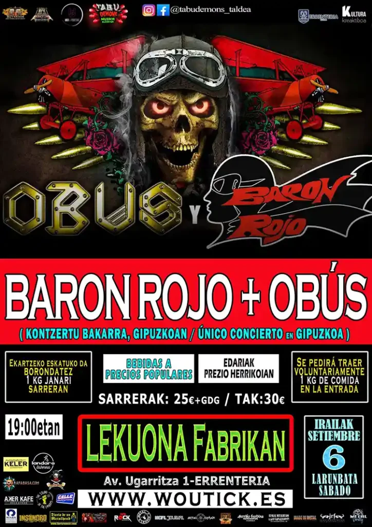 Barón Rojo y Obús, los dos grandes titanes de heavy-rock estatal actuarán juntos este sábado por primera y probablemente única vez en Gipuzkoa en una noche que promete ser memorable, de la mano de la asociación Tabu Demons pondrán patas arriba el Lekuona Fabrika de Errenteria. La apertura de puertas será a las 19:00 con una barra dentro a precios populares a cargo de la asociación.