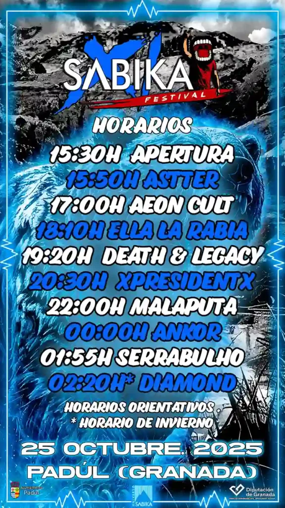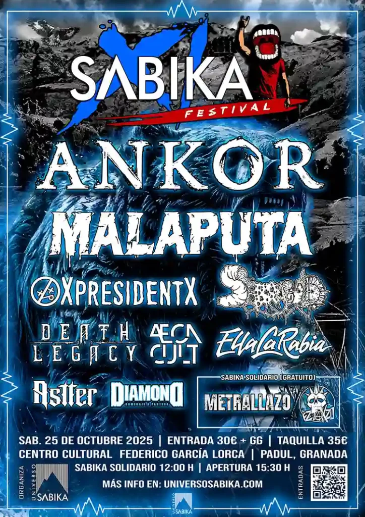 Este sábado se celebrará la undécima edición del Sabika Festival, que se llevará a cabo en el Centro Cultural Federico García Lorca (Padul, Granada), con las actuaciones de Ankor, Malaputa, XpresidentX, Death & Legacy, Serralbulho, Ella La Rabia, Astter, Diamond (tributo a Pantera), Eztakzo, Metrallazo y Aeon Cult. La organización ya ha dado a conocer los horarios de las actuaciones. Entradas a la venta al precio especial de 30 euros más gastos en https://entradium.com/es