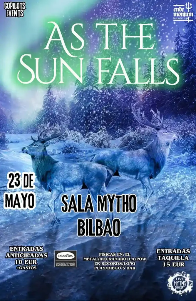 La banda finlandesa de death metal melódico As The Sun Falls estará presentando su último trabajo “Kaamos”, el día 23 de mayo en la sala Mytho (Bilbao). Herederos de todo el misticismo que siempre haenvuelto la música de Insomnium o Amorphis, pero con la pegada de unos Amon Amarth boreales. Un viaje inmersivo a las profundidades de la melancolía finlandesa, invitando a abrazar la oscuridad y sumergirse en la melancolía profundamente arraigada del Norte. Entradas anticipadas al precio de 10 euros más gastos en https://entradium.com En taquilla: 15 euros.
