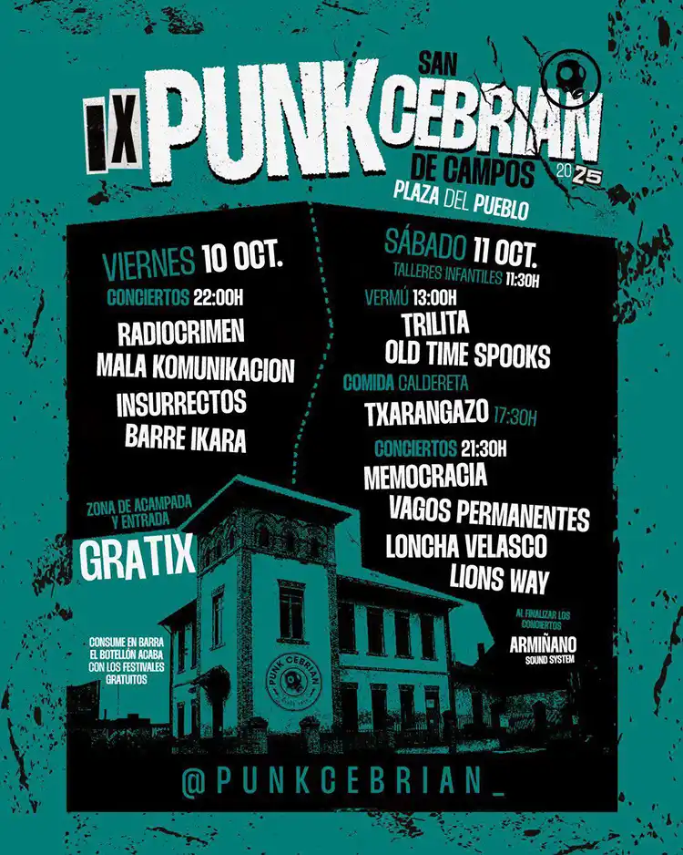 Radiocrimen, Mala Komunikacion, Insurrectos, Barre Ikara, Memocracia, Vagos Permanentes, Loncha Velasco, Lions Way, Trilita, Old Time Spooks y un Txarangazo para mover el esqueleto entre bocado y bocado es toda la programación musical que han planeado los organizadores del festival Punk Cebrian para la novena edición del festival, que se llevará a cabo los días 10 y 11 de octubre en la Plaza del pueblo de San Cebrián de Campos (Palencia). Dos días de pueblo y buen rollo. Además habrá talleres infantiles para que los peques también se conviertan en punkis de bien y zona de acampada para que nadie duerma en un portal. Entrada libre.