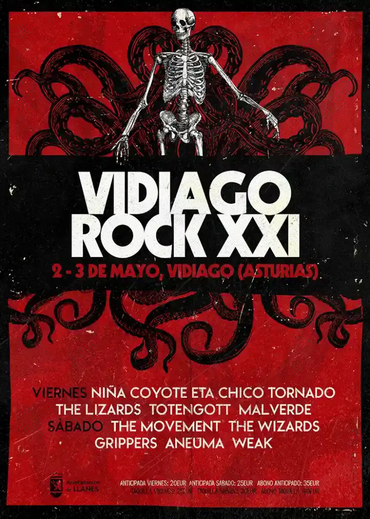 En esta XXI Edición, el festival estará encabezado por dos nombres de peso: Niña Coyote eta Chico Tornado y The Movement. Desde Euskadi, Niña Coyote eta Chico Tornado desplegará su inconfundible mezcla de Desert Rock y riffs demoledores. Con un directo intenso y arrollador, que los ha llevado a girar por todo el mundo (México, USA, Japón… y prácticamente toda Europa), llegan a Vidiago como una de las bandas imprescindibles del género. Por su parte, los daneses The Movement son uno de los grupos más destacados del Mod-Rock y el Punk ’77 europeo. Con una dilatada trayectoria y giras constantes por todo el continente, su directo promete ser uno de los momentos más incendiarios del festival.