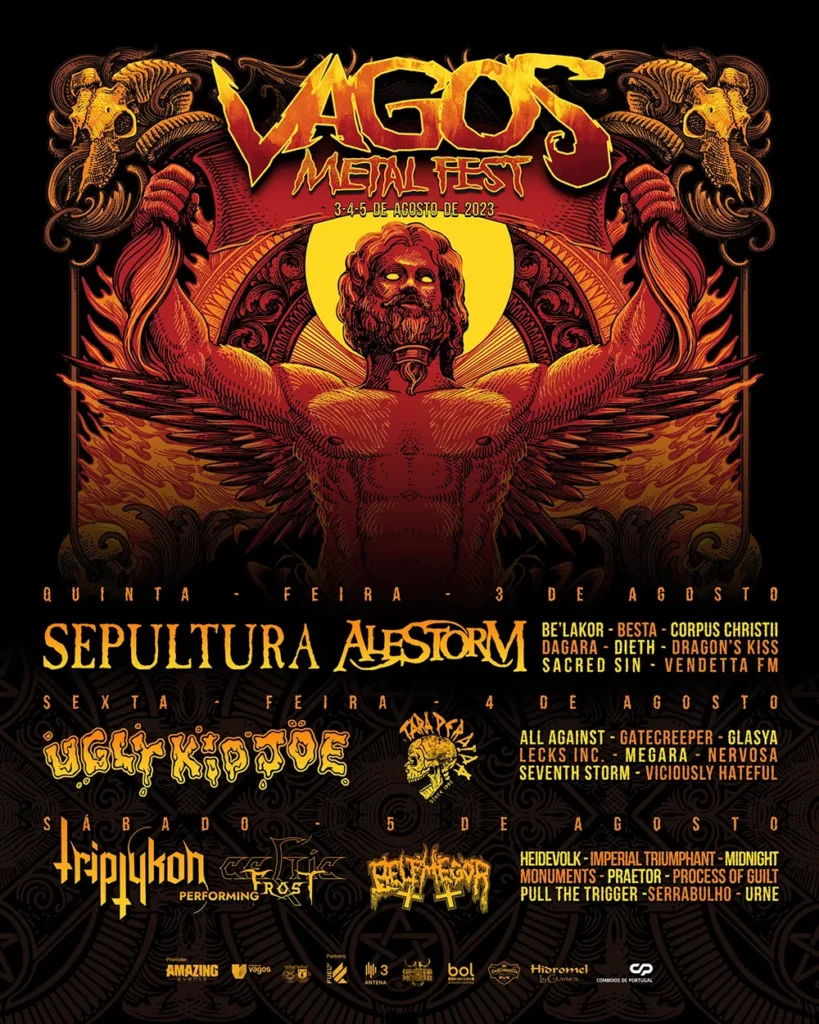 Alestorm, All Against, Be’lakor, Belphegor, Besta, Corpus Christ, Dagara, Dieth, Dragon´s Kiss, Gatecreeper, Glasya, Heidevolk, Imperial Triumphant, Lecks Inc., Megara, Midnight, Monuments, Nervosa, Praetor, Process Of Guilt, Pull The Trigger, Sacred Sin, Sepultura, Serrabulho, Seventh Storm. Tara Perdida, Triptykon, Ugly Kid Joe, Urne. Vendetta F.M y Viciously Hateful son las formaciones que componen el cartel de la sexta edición del Vagos Metal Fest, que tendrá lugar los días 3, 4 y 5 de agosto en Quinta do Ega (Vagos, Aveiro). Abonos a la venta en https://www.masqueticket.com