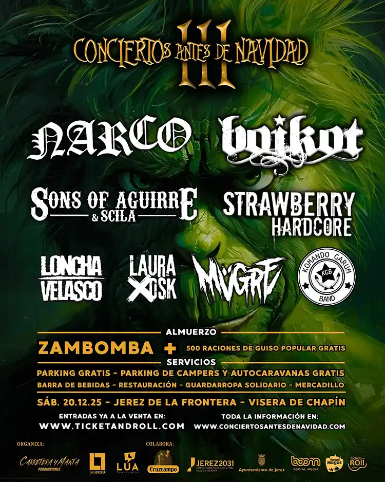 El 20 de diciembre se llevará a cabo la tercera edición del festival Conciertos Antes de Navidad en la visera del Palacio de Deportes de Chapín (Jerez de la Frontera). Evento musical organizado por la productora jerezana Carretera y Manta Producciones, La Librería y LÚA Comunicación. Las bandas que participarán en esta nueva edición son: Narco, Boikot, Sons of Aguirre & Scila, Strawberry Hardcore, Loncha Velasco, Laura DSK, Mugre y Komando Garum band. Además habrá un almuezo con zambomba más 500 raciones de guiso popular gratis. Entradas a la venta en www.ticketandroll.com y www.conciertosantesdenavidad.com.