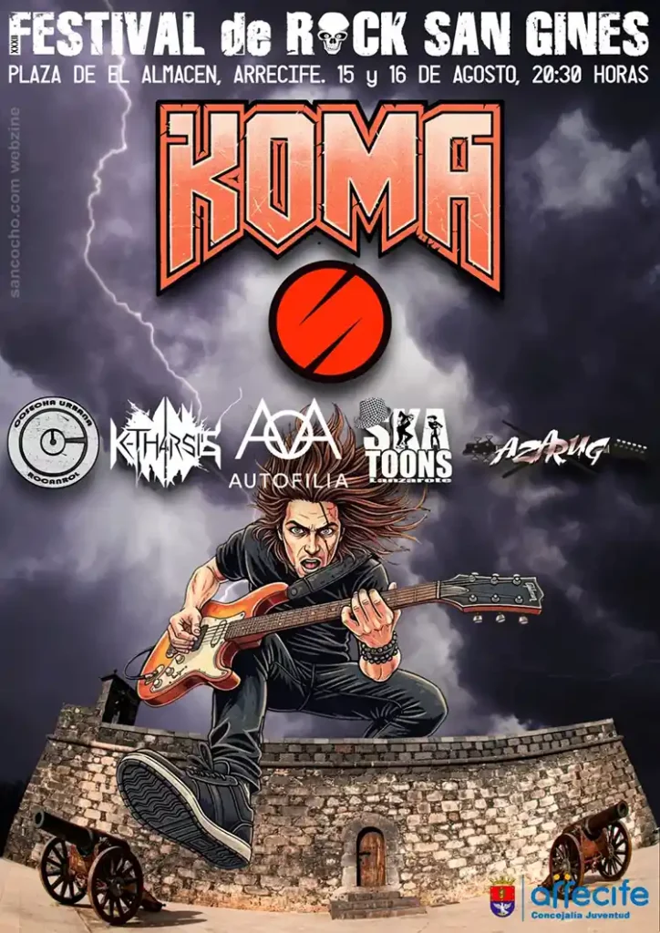 Los días 15 y 16 de agosto se celebrará la trigésima segunda edición del Festival de Rock San Gines en la Plaza de El Almacén en Arrecife (Lanzarote, Las Palmas). Las bandas que actuarán son las siguientes: Koma, Cosecha Urbana, K-Tharsis, Autofilia, The Skatoons y Azarug. 20:30. Entrada libre.