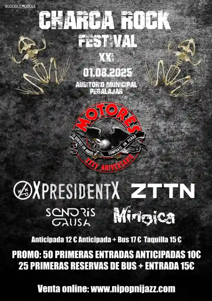 El 1 de agosto tendrá lugar la vigesima primera edicion del festival Charca Rock en el Auditorio Municipal de Pegalajar (Jaén), con las actuaciones de Los Motores, XpresidentX, Zutaten, Sonoris Causa y Minoica. Anticipada: 12 euros (primeras 50 entradas al precio especial de 10 euros) en https://tienda.nipopnijazz.com. En taquilla: 15 euros.