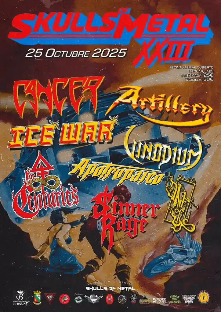 Cancer y Sinner Rage son las bandas que reemplazan a Heathen en el cartel de la vigésima tercera edición del Skulls of Metal Fest, que se llevará a cabo el 25 de octubre en en el Recinto Ferial Cubierto de Bejígar (Jaén). La agencia de management de Heathen comunicó hace unos días que la banda no llevará a cabo ningún concierto en Europa el próximo otoño por cuestiones económicas. Entradas a la venta al precio promocional de 20 euros enviando un mail a 𝐬𝐤𝐮𝐥𝐥𝐬𝐨𝐟𝐦𝐞𝐭𝐚𝐥𝐟𝐞𝐬𝐭@𝐠𝐦𝐚𝐢𝐥.𝐜𝐨𝐦.