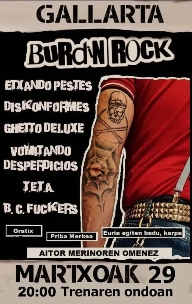 Etxando Petes, Diskonformes, Getto Deluxe, Vomitando Desperdicios, T.E.T.A y B.C. Fuckers compartirán escenario en la próxima edición del Burdin Rock, que se llevará a cabo el 29 de marzo junto a la parada de tren de Gallarta (Bizkaia). Entrada libre.