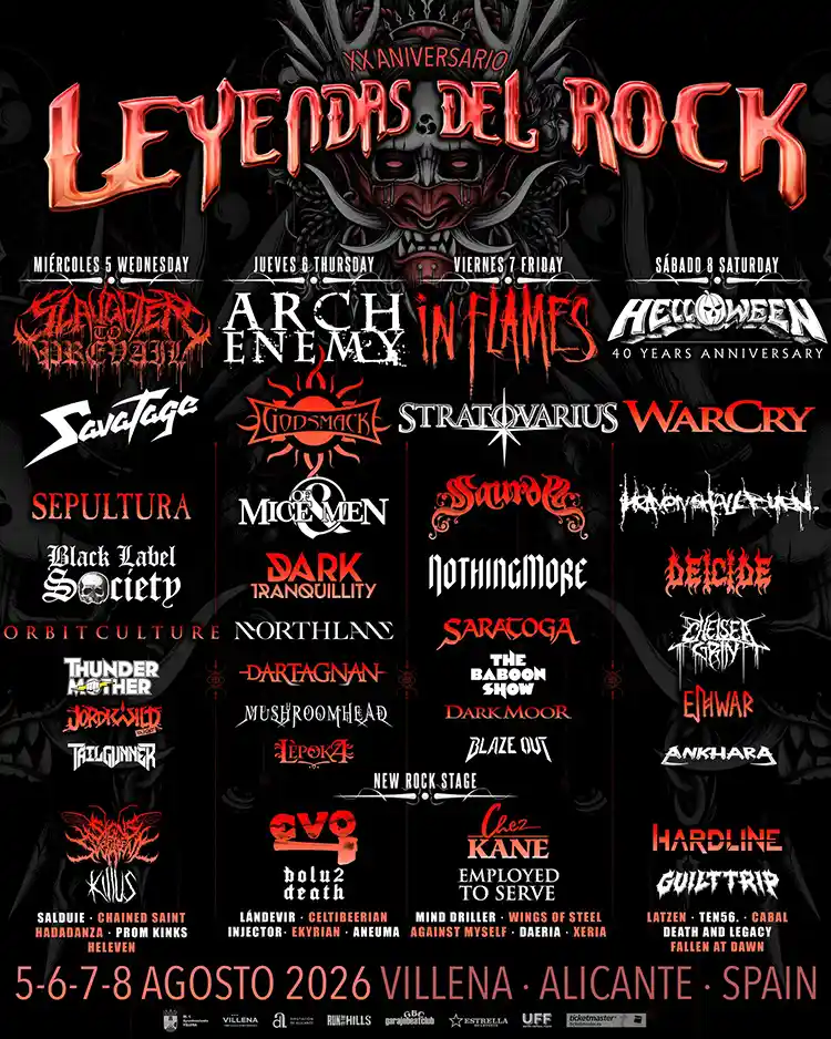 Arch Enemy, Stratovarius, Dartagnan, Thundermother, Tailgunner, Jordi Wild Dj Set, Lèpoka, Ankhara, Guilt Trip, Signs Of The Swarm, Employed To Serve, Evo, Chained Saint, Wings Of Steel, Injector, Lándevir, Celtibeerian, Killus, Bolu2 Death, Salduie, Blaze Out, Death & Legacy, Hadadanza, Against Myself, Daeria, Mind Driller, Ekyrian, Xeria, Aneuma, Prom Kinks, Fallen At Dawn y Heleven son las últimas incorporaciones al cartel de la próxima edición del Leyendas del Rock, que tendrá lugar del 5 al 8 de agosto de 2026 en Villena (Alicante). Entradas sueltas al precio de 99 euros más gastos y el abono para los 4 días de festival estará disponible hasta el 31 de diciembre al precio de 180 euros más gastos en https://www.ticketmaster.es