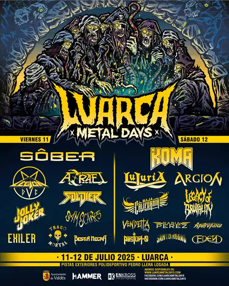 En la primera jornada actuarán Sôber, Azrael, Legion DC, Jolly Joker, Soldier, Sam Scares, Trago Mortal, Exiler y Bestia Negra. En la segunda le tocará el turno a Koma, Lujuria, Baja California, Legacy Of Brutality, Argion, Vendetta F.M, Rabia Perez, Santonegro, Postum-0 y Eden. Abonos y entradas de día en www.luarcametaldays.com