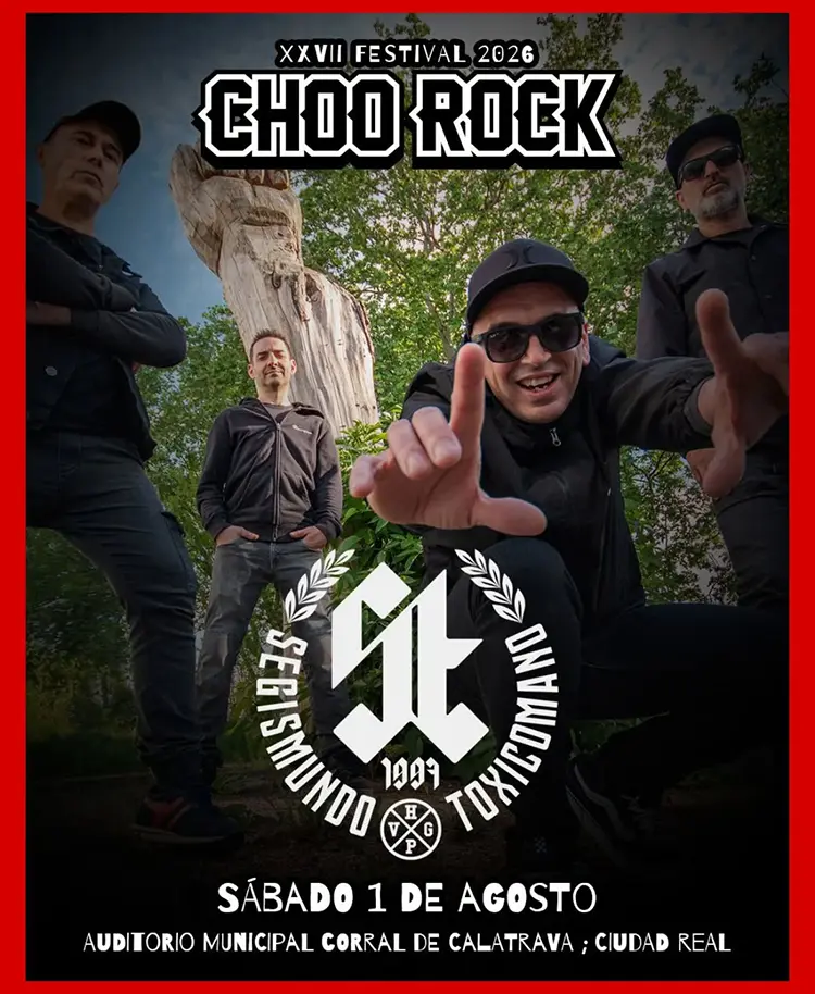 Ya han comenzado a desvelar los organizadores del ChooRock Festival el cartel de la vigésimo séptima edición, que tendrá lugar el 1 de agosto de 2026 en el Auditorio Municipal de Corral de Calatrava (Ciudad Real). La primera banda confirmada es Segismundo Toxicómano, quienes ya han actuado varias veces en el festival, plantando semilla punk en los primeros años de andadura del festival, forman parte, por derecho propio, de la historia del mismo, reventando el antiguo auditorio en las ediciones 2002 y 2010 y, además, revolucionando en 2006 la mítica discoteca (antes cine) “Mascopas”.