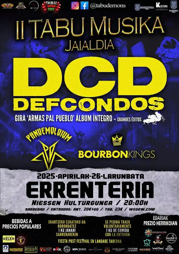 El 26 de abril se llevará a cabo la segunda edición del Tabu Musika Jaialdia en el Centro Cultural Niessen (Errenteria, Gipuzkoa). Las bandas que participarán son las siguientes: Pandemoldium, Bourbon Kings y Def Con Dos. Los madrileños Def Con Dos interpretarán al completo su disco “Armas Pal Pueblo” y sus grandes éxitos.