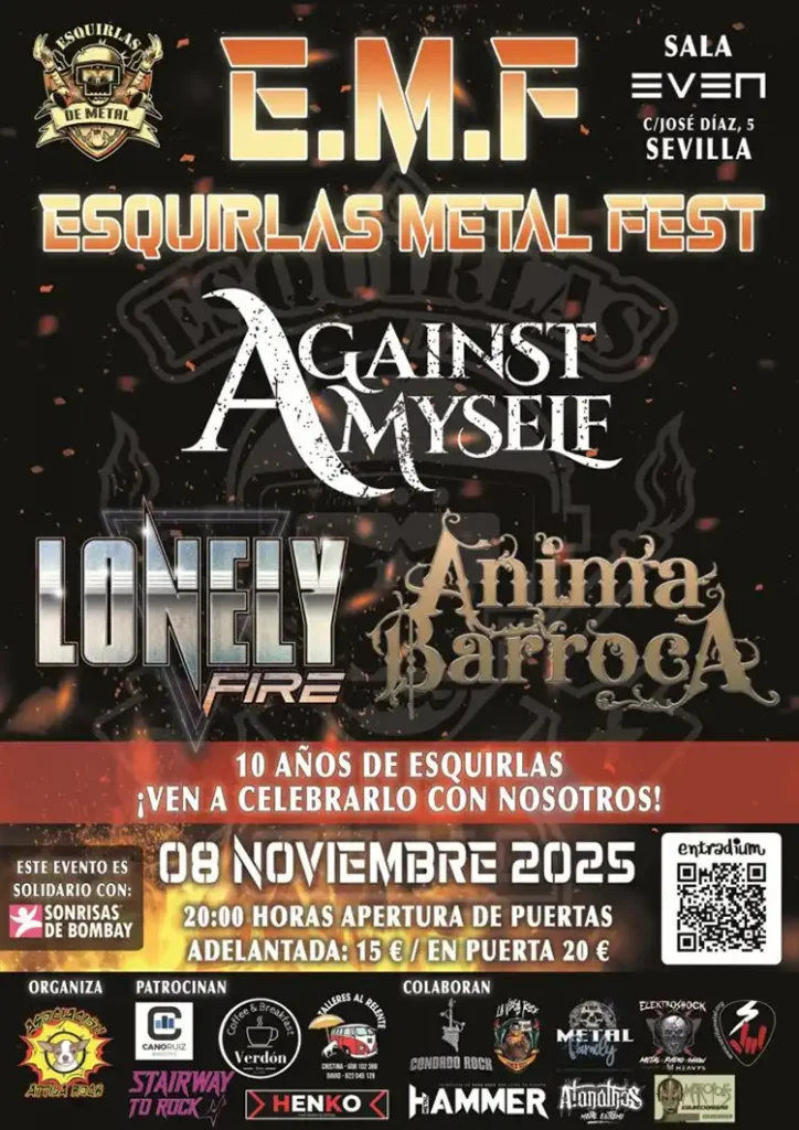 La web musical Esquirlas Metal cumple su décimo aniversario, y lo celebrará este sábado organizando el festival Esquirlas Metal Fest en la sala Even (Sevilla), con las actuaciones de Against Myself, Lonely Fire y Ánima Barroca. 20:00 horas. Anticipada: 15 euros más gastos en https://entradium.com. En taquilla: 20 euros.