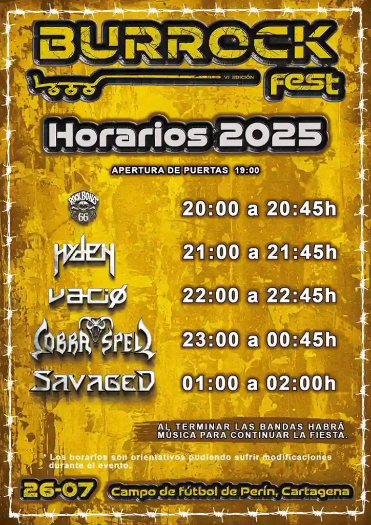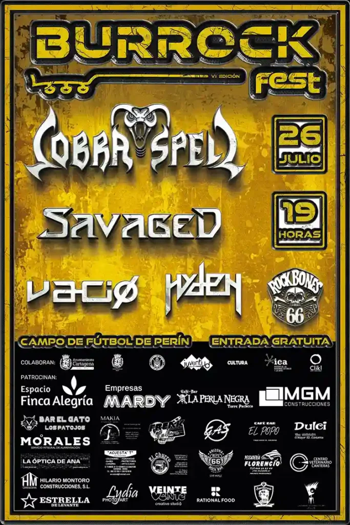 Cobra Spell, Savaged, Vacío, Hyden y Rock Bones 66 son las formaciones que participarán este sábado en la edición de este año del Burrock Fest, que se llevará a cabo en el Campo de futbol de Perín (Catagena), con entrada libre.